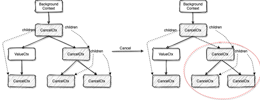 type cancelCtx struct { Context mu sync.Mutex // protects following fields done chanstruct{} // created lazily, closed by first cancel call children map[canceler]struct{} // set to nil by the first cancel call err error// set to non-nil by the first cancel call }
